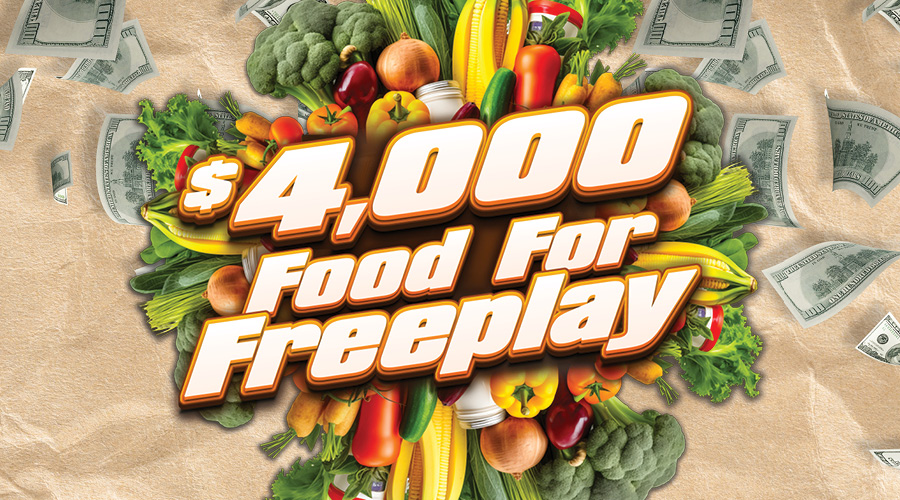 Limit 20x entries/day. Donated items must NOT be expired. Packages/boxes must remain intact. No glass jars will be accepted. See full list of acceptable items at Player Services. Management reserves all rights. Limit 2x wins/hour. Limit 2x top of hour wins. Must be present to win.
